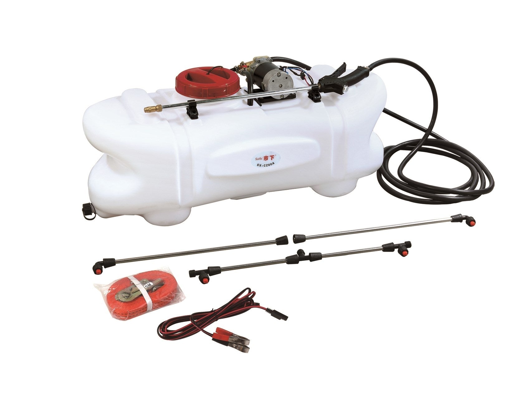 This weed and boom sprayer tank comes with a 5m hose, spray gun, spray boom and 2 fasten straps. Can be mounted on ATVs, quad bikes, four wheels motorcycles & mowers.The pressure activated diaphragm pump produces a smooth flow from the tank. The tank is manufactured from special chemical resistand polymeters for extra long life. It can be used for spraying fertillizer, week killer, de-icer and ethlene glycol products.