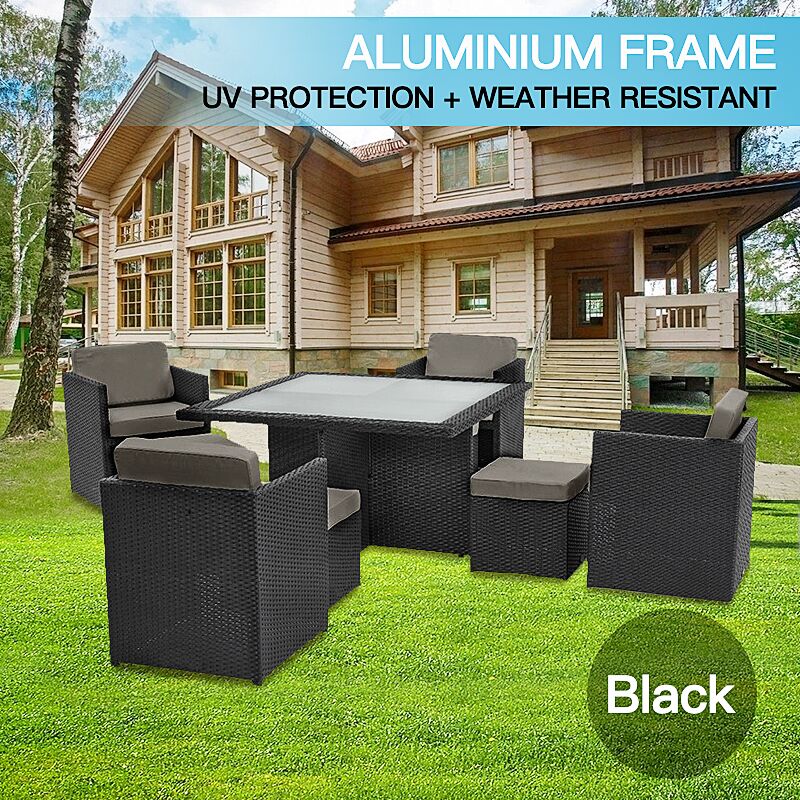 9pc PE Wicker Outdoor Aluminum Garden Furniture Dining Setting - Black (9010)